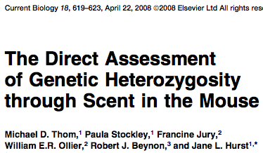 Thom MD, Stockley P, Jury F, Ollier WE, Beynon RJ, Hurst JL. (2008) The direct assessment of genetic heterozygosity through scent in the mouse. Curr Biol. 18, 619-623.[PUBMED][PDF]