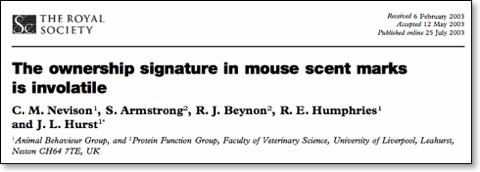 Nevison, C.M., Armstrong, S.; Beynon, R.J. Humphries, R.E. & Hurst, J.L. (2003) The ownership signature in mouse scents marks is involatile. Proceedings of the Royal Society series B, 270, 1957-1963 [PUBMED] [PDF]